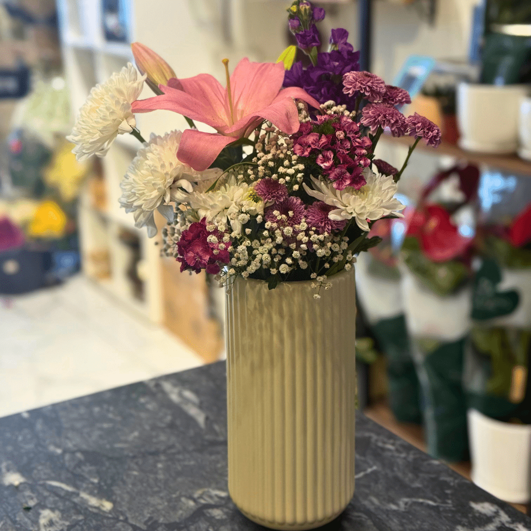 • فازة خزفية أنيقة تضم زنابق وردية وجوري لتكريم الأم.