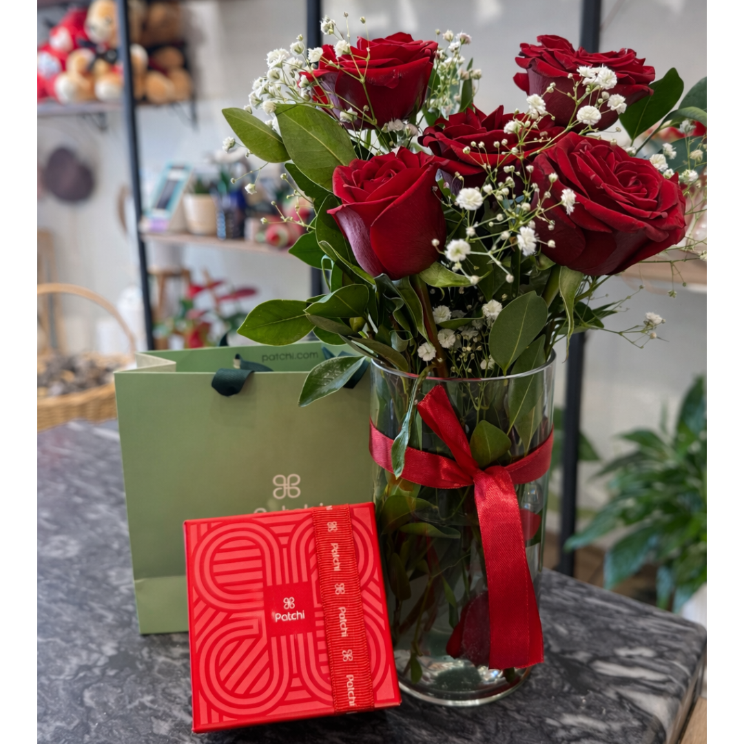 - A graceful blend of beauty and taste; 5 fresh red roses in a sleek glass vase, paired with 180g of premium Patchi chocolates. The perfect gesture for every heartfelt moment.