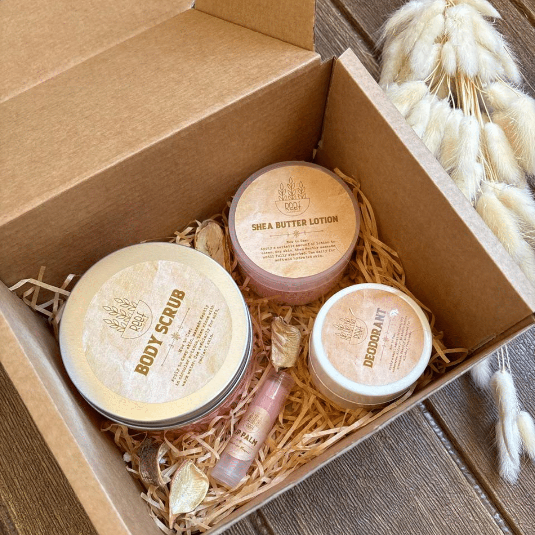 This premium set includes a Body Scrub (250 ml) to exfoliate and renew your skin, a Deodorant for long-lasting freshness, a Body Butter (100 ml) for deep hydration, and a Lip Balm to keep your lips soft and smooth.