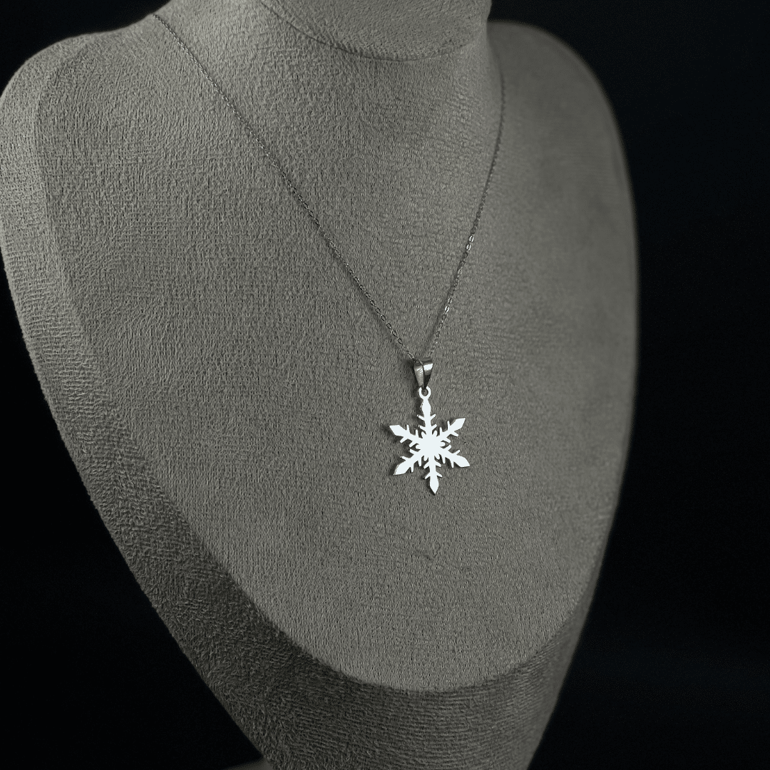 - A sleek and elegant winter-inspired necklace featuring a finely crafted stainless-steel snowflake charm. Durable, shiny, and perfect for everyday wear or as a thoughtful seasonal gift.