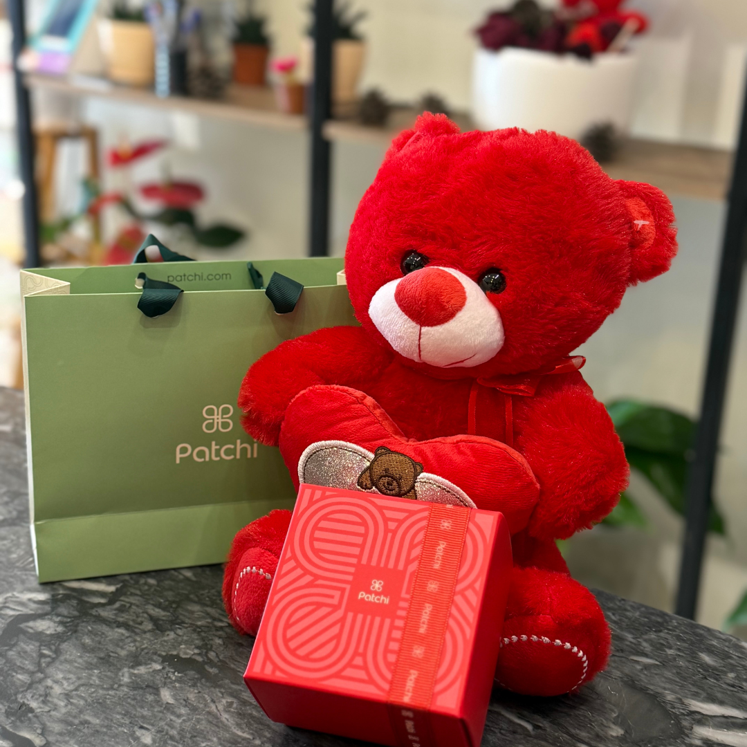 - The ultimate duo of tenderness and taste; a soft red teddy bear paired with 180g of exquisite Patchi chocolates. A simple yet deeply meaningful gift to brighten anyone’s day.